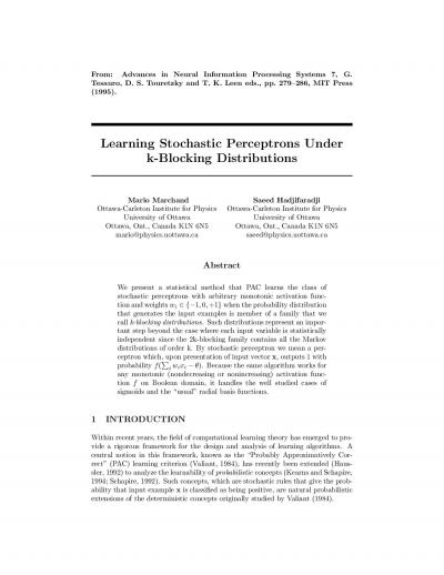 Learning Stochastic Perceptrons Under k-Blocking Distributions