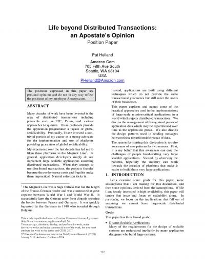 Life beyond Distributed Transactions: an Apostate's Opinion
