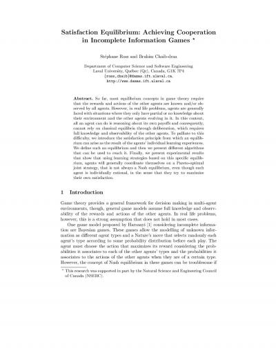 Satisfaction Equilibrium: Achieving Cooperation in Incomplete Information Games